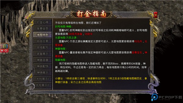 通过击败怪物掉落的隐藏地图券,玩家可以进入隐藏地图,挑战超高爆率的BOSS,获取GM装备、神器以及转生材料。不过,需要注意的是,进入后每张地图券有效期为2小时,因此提高效率至关重要。建议玩家根据自身实力选择适合的地图: