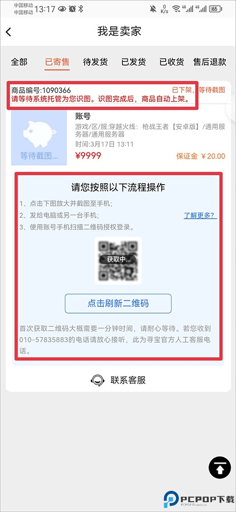 7、最后在已寄售界面内按照提示操作,并等待系统托管客服为您识图,识图完成后商品会自动上架。