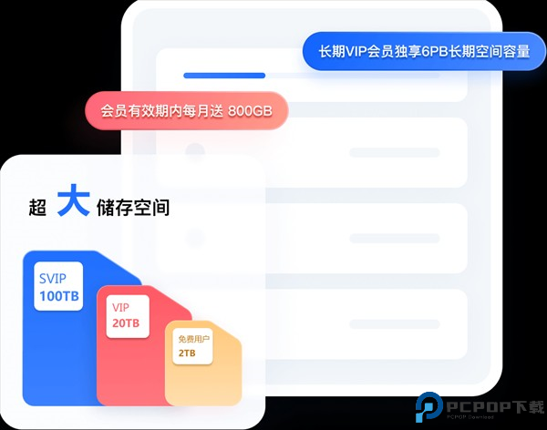 免费用户注册即送2TB容量,VIP享20TB容量,SVIP享100TB容量,长期VIP享6PB超大容量,会员有效期内,每月额外赠送800GB成长容量