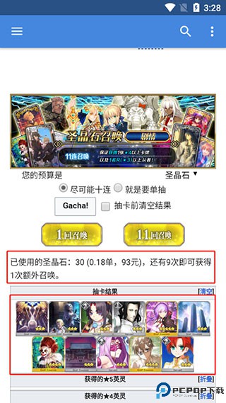 4、抽卡完成,下方显示抽卡结果,同时上方还会模拟真实的抽卡幸运值。