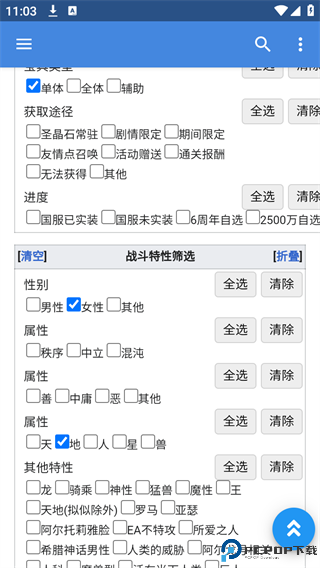 4、勾选完成后下拉到应用最底部,就能看到对应标签的英灵。