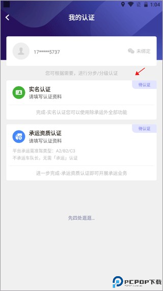 2、有两个认证类型,先实名认证之后才可以进行承运资质认证,点击上方的实名认证。