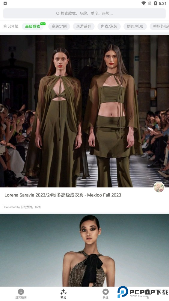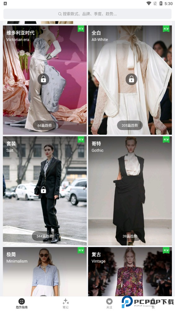 1、在首页中,可以看到数万篇时装笔记,涵盖秀场、街拍、Lookbook等,还可以查看各个年度有关时装的笔记;在上方的搜索栏中可以进行款式、品牌、季度以及趋势等的搜索。