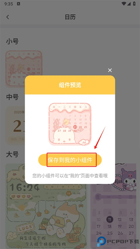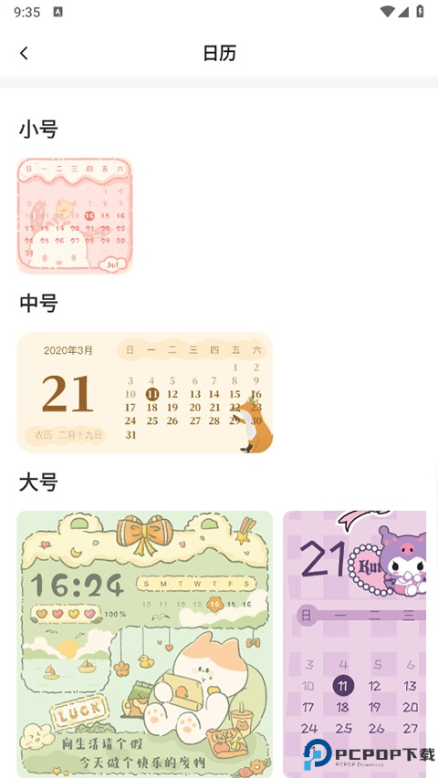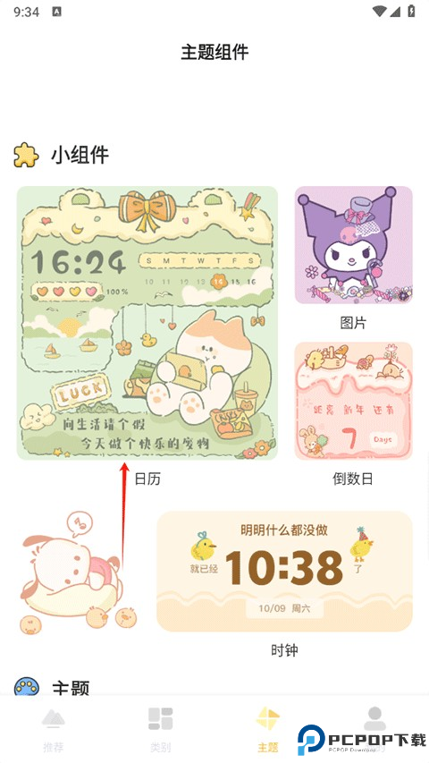 1、在主题界面内上方挑选你想添加的小组件,例如日历。