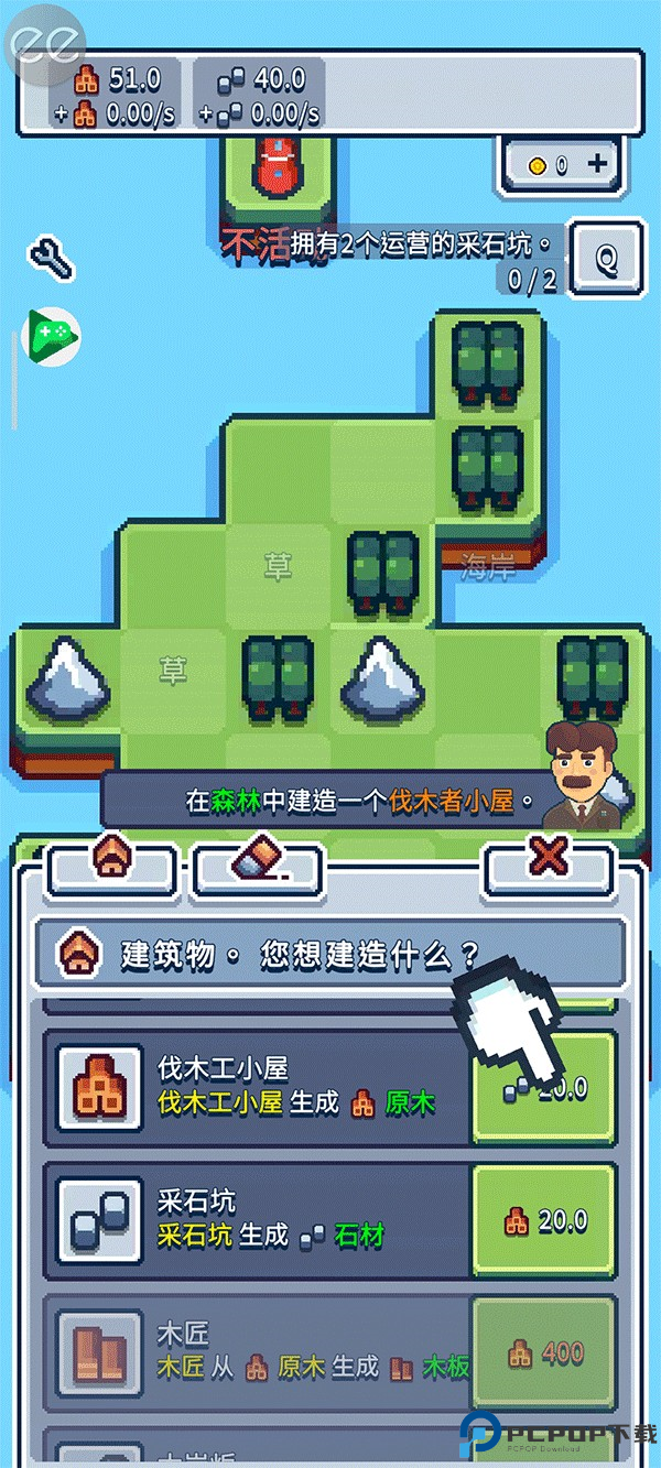 5、点击房屋标志,即可打开建造列表。在列表里找到伐木工小屋并点击即可