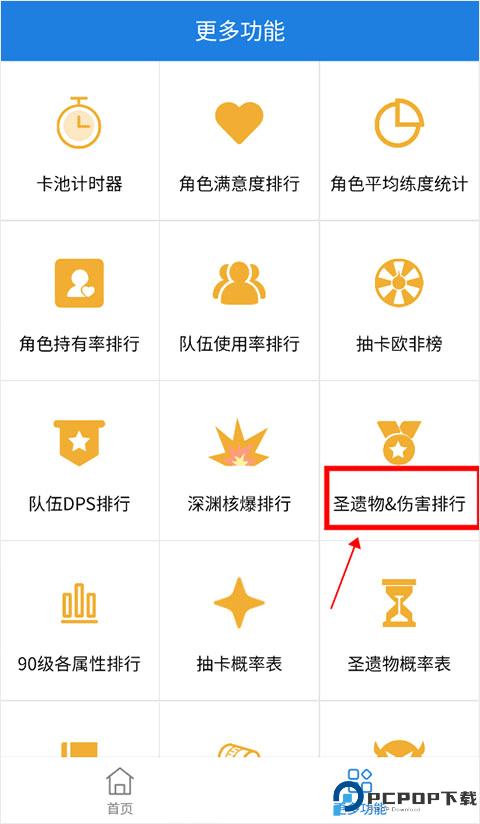 1、在“更多功能”页面选择“圣遗物/伤害排行”。