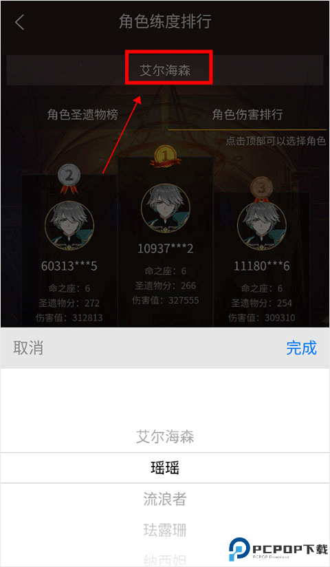 2、然后从上方的角色圣遗物榜切换到伤害榜,点击顶部的名称可以选择不同的角色进行查看。