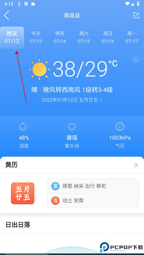 2、进入后可以看到本日的天气情况,我们往左滑动即可看到历史天气情况