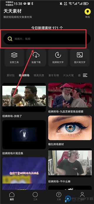 3、链接复制后打开天天素材app,并在工具界面中点击批量下载