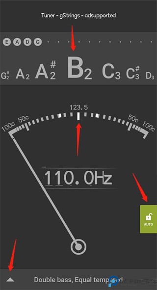 二、当绿色AUTO键或TUNE AUTO键亮起的时候,表示gStrings调音器已经进入到了自动侦测音高的调音模式了,现在将手机的MIC尽量贴在琴面或琴的一侧,放在音龙池音孔下方也可以,这里要注意把刻度表和中间的频率显示区域露出来,得看得见他们才行。