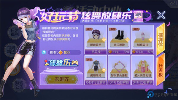 2、先来看看好玩节活动给dancer们准备了哪些好礼吧,好玩节的活动时间是4月11日-4月28日,在活动期间,dancer们可以通过完成每天的随机任务和每天登录送的80欢乐币获得,攒够一定数量的欢乐币就可以兑换套装、头像框、和名片装饰了,在每天的随机任务中,有一个任务带红包标志,如果dancer们想要尽快获得奖励,那么一定要接这个任务,运气好可以直接在红包中获得100欢乐币哦。