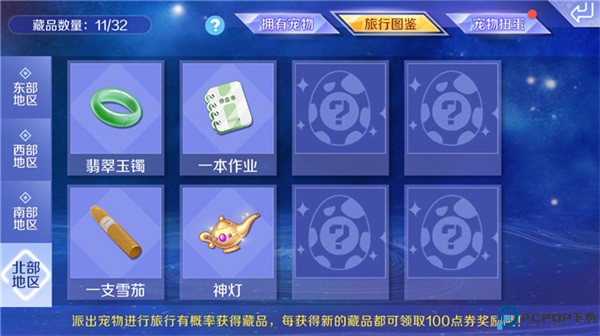 派自己的萌宠外出旅行也可以增加宠物们的经验哦!旅行之前需要准备好宠物需要的食物和行装,食物和行装也是可以通过宠物扭蛋获得的。选择不同的食物和行装会影响不同的旅行地点,当宠物旅行回来时,还有机会可以获得不同地区的藏品和点券奖励哦!在这里需要大家注意,派出旅行的宠物是无法喂养、升阶、携带的,所以大家在派出爱宠旅行前一定要提前做好安排哦!
