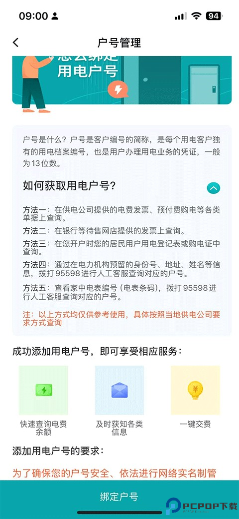 2、在户号管理页面中,你会看到所有已绑定的户号列表;当然首先需要绑定户号,详细获取用电户号的方式如下图(目前为了安全,平台已不允许绑定他人户号了)。
