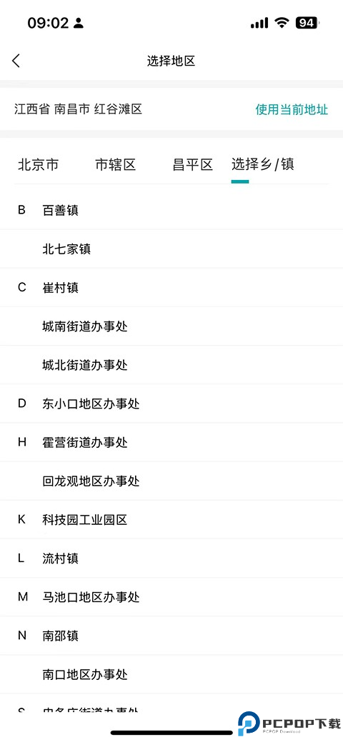 4、选择你所在的地区,精确到乡/镇。