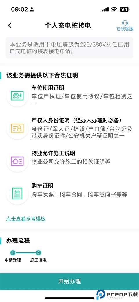 5、该业务需提供如车位使用证明、产权身份证明、物业允许施工说明以及购车证明等合法证明,确认已准备齐全点击下方开始办理按钮即可。