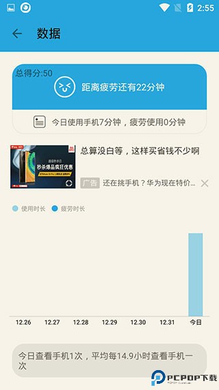 3、选择数据部分,你可以看到你今日使用手机的情况、距离疲劳使用的时间还有平均看手机的次数及趋势。