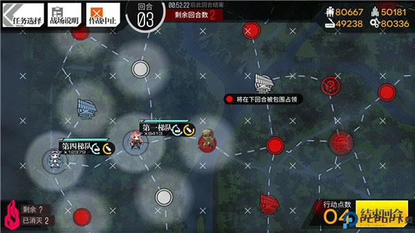 在全新的夜战模式中,战术地图会被战争迷雾所覆盖,指挥官所部署的梯队视野会受到限制。如果进入战场的梯队中没有编入手,该梯队将只能看见当前自己所在位置的情况;如果编入了手,该梯队的视野将会为1(即侦查到自身路径点距离为1的路径点情况)。另外,地图上新增了一类路径点:雷达。梯队占领雷达后,雷达可为指挥官永久提供距离该点2以内的所有路径点情况,直到该雷达再次被敌方占领为止。