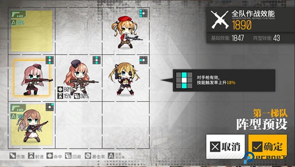 除了推图时比较注重策略走法以外,游戏的编队也是特别讲究策略性。在游戏中玩家可以从 HG(手)、SMG(冲锋)、MG(机)、AR(突击步)、RF(步)五种武器类型当中任意选择角色然后进行队伍编排,而这些武器都拥有 buff 格设定(游戏中为影响格效果),其作用是为队友增加额外的能力效果。