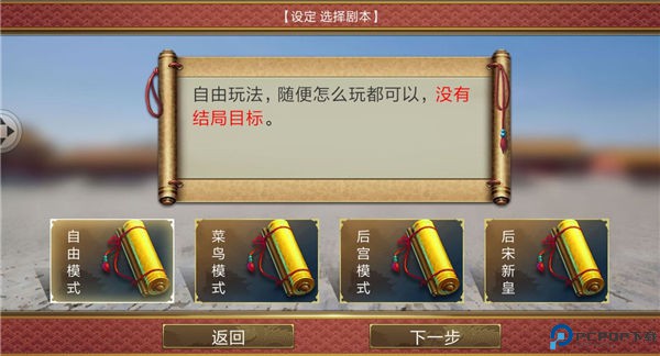 二、模式分为:自由模式、菜鸟模式(暂未开放)、后宫模式、后宋新皇;