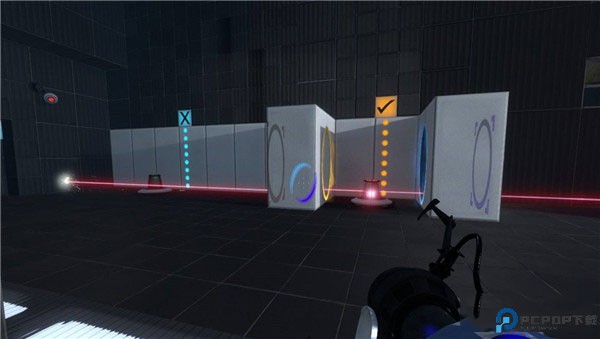 4、虽然,游戏是以第一人称射击的形式进行,但是却没有械战斗的场景。因为手中的“传送门”除了开启传送门解决谜题外,没有任何攻击力。再加上玩家控制的主人公穿着可以防止从高空掉落受伤的机械鞋,所以没有摔死的可能。取而代之,玩家身亡的方法,变为了被游戏中的机塔(Turret guns)击中,且严重受伤身亡、碰到致命激光网、掉入有毒液体中、被压死或掉入深渊,被激光束碰到只会受伤,若故意持续接触激光束最终也会死亡。不过即便如此,如果仅仅是擦到,主角也能通过静息回血慢慢地恢复生命值,类似于使命召唤的回血机制。