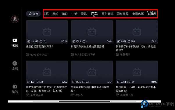 1、进入哔哩哔哩车机版,其左侧为主要功能栏:FM、视频、续播、我的。默认打开的界面为:FM