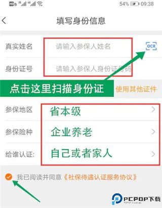 4、『填写身份信息』可以手动输入,也可以扫描身份证录入,扫描可能需要多试几次。『参保地区』、『参保险种』、『给谁认证』可以参考绿字。记得勾选我已阅读并同意《社保待遇认证服务协议》。