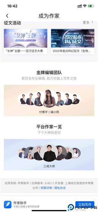 同样在底部找到“立即写作”,在这里需要用户下载并安装“作者助手”。