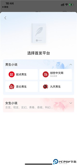 3、完成账号登录后,便可定义书名。之后选择首发平台,男生小说可选择的首发平台包括起点男生、创世中文网、昆仑男生和九天男生;女生小说可选择的首发平台起点女生、云起书院、红袖添香、潇湘书院、昆仑女生及九天女生等。