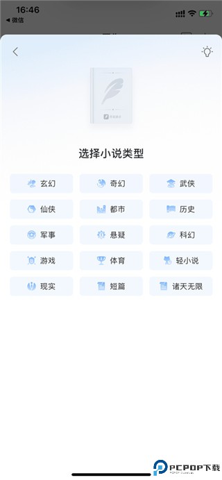 4、然后挑选小说类型,如玄幻、奇幻、武侠、仙侠、都市、历史、军事、悬疑、科幻、游戏、体育、轻小说以及现实、短篇和诸天无限等等。