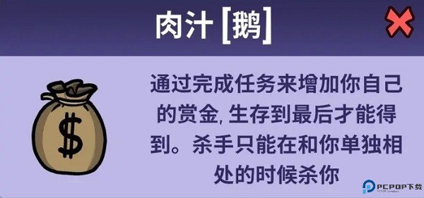 肉汁 - 完成任务会增加你在游戏结束时获得的赏金,如果你被鸭子杀死,他将获得赏金。