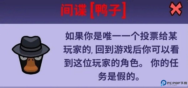 间谍 - 如果你是会议期间唯一一个投票给某个玩家的人,你可以得知他的身份。对付模仿鹅很有用:鸭子的数量是事先设置好的,但有模仿鹅时,鸭子阵营便会多出一只鸭子,此时间谍就可以用技能找出模仿鹅。