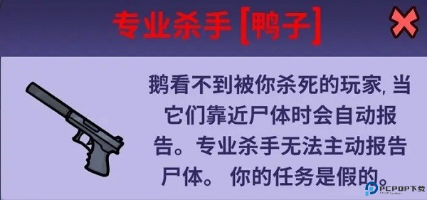 专业杀手 - 击杀后无法自我报告;其他鹅看不到你杀死的玩家的尸体,但其他鹅靠近尸体时会自动报告。