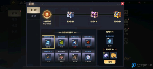 3、完成6次捐献任务后,如果缺材料才能到8次,可以发起求助,请求公会好友捐献材料,加一个活跃的公会很重要