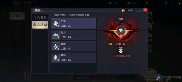 4、公会修炼,分为公会增益和个人增益,公会增益仅会长可以升级,提供四维属性,对所有公会成员生效,公会等级越高,增益等级上限越高,个人增益可以提供更多的属性增加效果,玩家需要消耗贡献币和银币升级