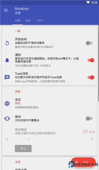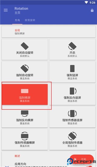 4、比如你要利用Rotation软件进行强制横屏,那么点击下“强制横屏”,再点击“开始”;
