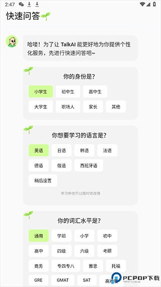 1、首先进入TalkAI练口语,选择自己的身份信息以及词汇水平