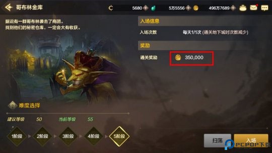 ②、50级之后可以进入哥布林金库,每个号每天可以刷35万金币。