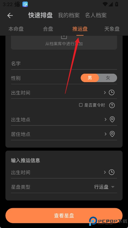 1、直接点击主界面的几种占星盘类型之一,输入出生信息后即可排出星盘