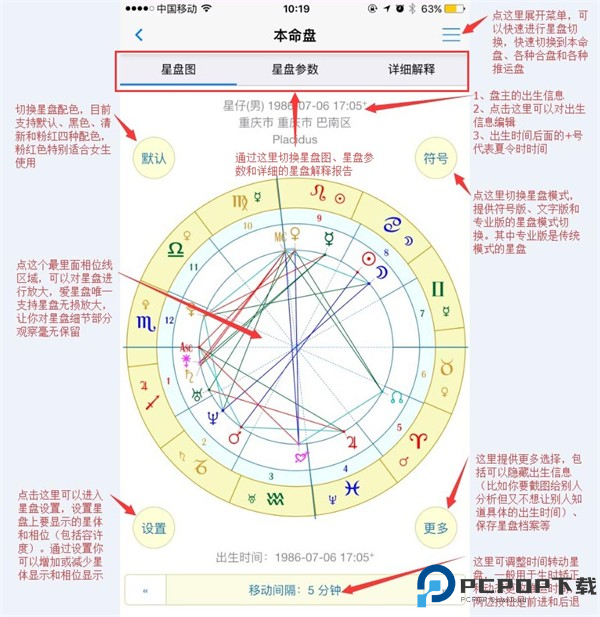 1、通过顶上的Tab选择或者手指左右滑动可以切换星盘图星盘参数列表和详细星盘解释二个内容