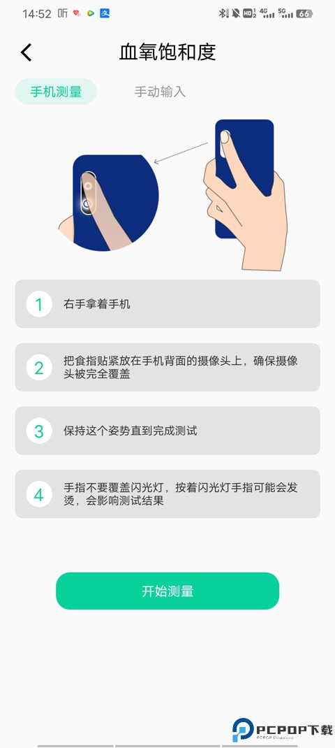 2、里面为用户提供手机测量和手动输入,手机测量的话,用右手拿手机,将食指紧贴手机背面的摄像头,确保摄像头完全覆盖,然后保持这个姿势,直到测试完成,用户需要注意手指不要覆盖闪光灯,否则可能会影响测试结果;