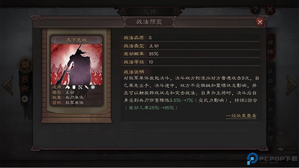 2、从战法属性上看,防御层面每回合必降低一位副将伤害百分之30,输出来看增加副将百分之25输出。同时提高主将百分之16的自带战法以及突击战法发动概率。