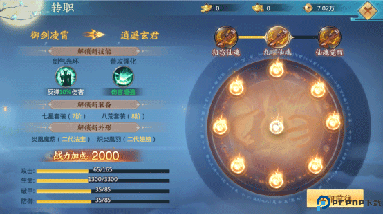 二转后将成为逍遥玄君,解锁新技能;解锁7阶/8阶装备,开放二代翅膀、法宝外形,同时为上仙增加大量战力