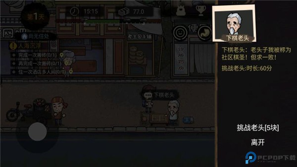 1、进入打工生活模拟器后,首先需要前往街边,找到一位大爷,与他进行对话。