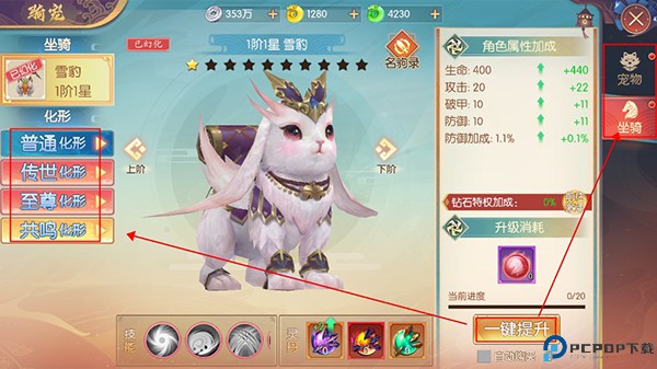 5、游戏内还有各种Q萌可爱的宠物和坐骑可以解锁,他们都可以升级进阶,转变形态,可以成为你的得力帮手。