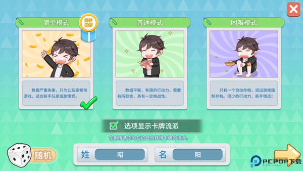 1、打开职场浮生记手游官方版,点击右侧新人入职开始游戏,选择游戏难度模式,并去一个姓名;