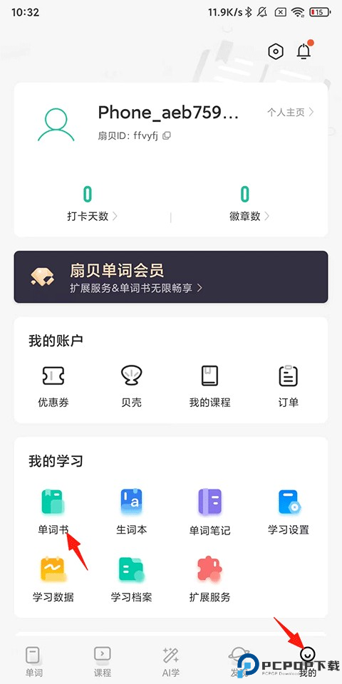 1、打开扇贝单词英语版,点击【我的】-【单词书】