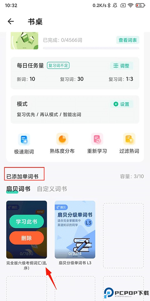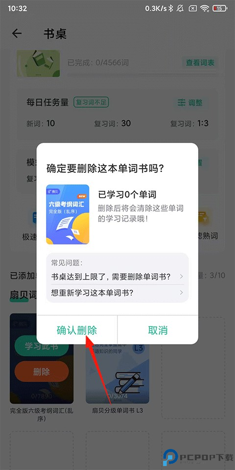 2、在打开的书桌页面中长按下方已添加且想要进行删除的单词书,点击【删除】。