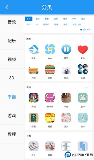 3、点击左上角就直接进入竖版的分类,左侧是类型,例如“平面”中就有“图标”、“模板”以及“样机”等,而“图标”又被分为“箭头”“Logo”“食物”“汽车”等等。