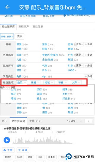 4、这里以“配乐”-“安静”为例,进入后在“高级选项”处可以更改自己的筛选条件,然后底部就会显示可供下载的资源了。