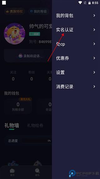 1、首先在平台上开聊天房需要完成实名认证,用户可以进入应用的【我】页面中点击右上角的扩展功能图标(下图红色箭头所指)